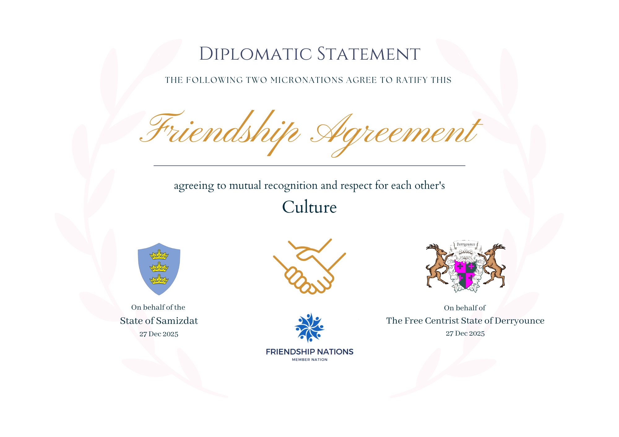Good Day Derryouncer’s! From the warm, cloudless days of Summer to the cold, rainy days of Winter, The Free Centrist State has survived almost all types of weather, and The Magenta Party is proud to announce so. The Micronation has done much progress over the past 70 days, and has great plans for the near future, and I’m glad all of you could help us with out Goals!